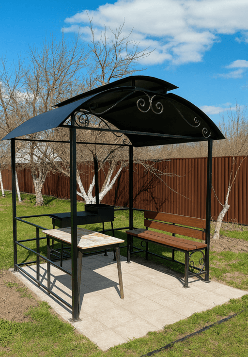 - Размер и форма: навес под мангальную зону изготавливается по индивидуальным размерам — цена зависит от площади и особенностей размещения.